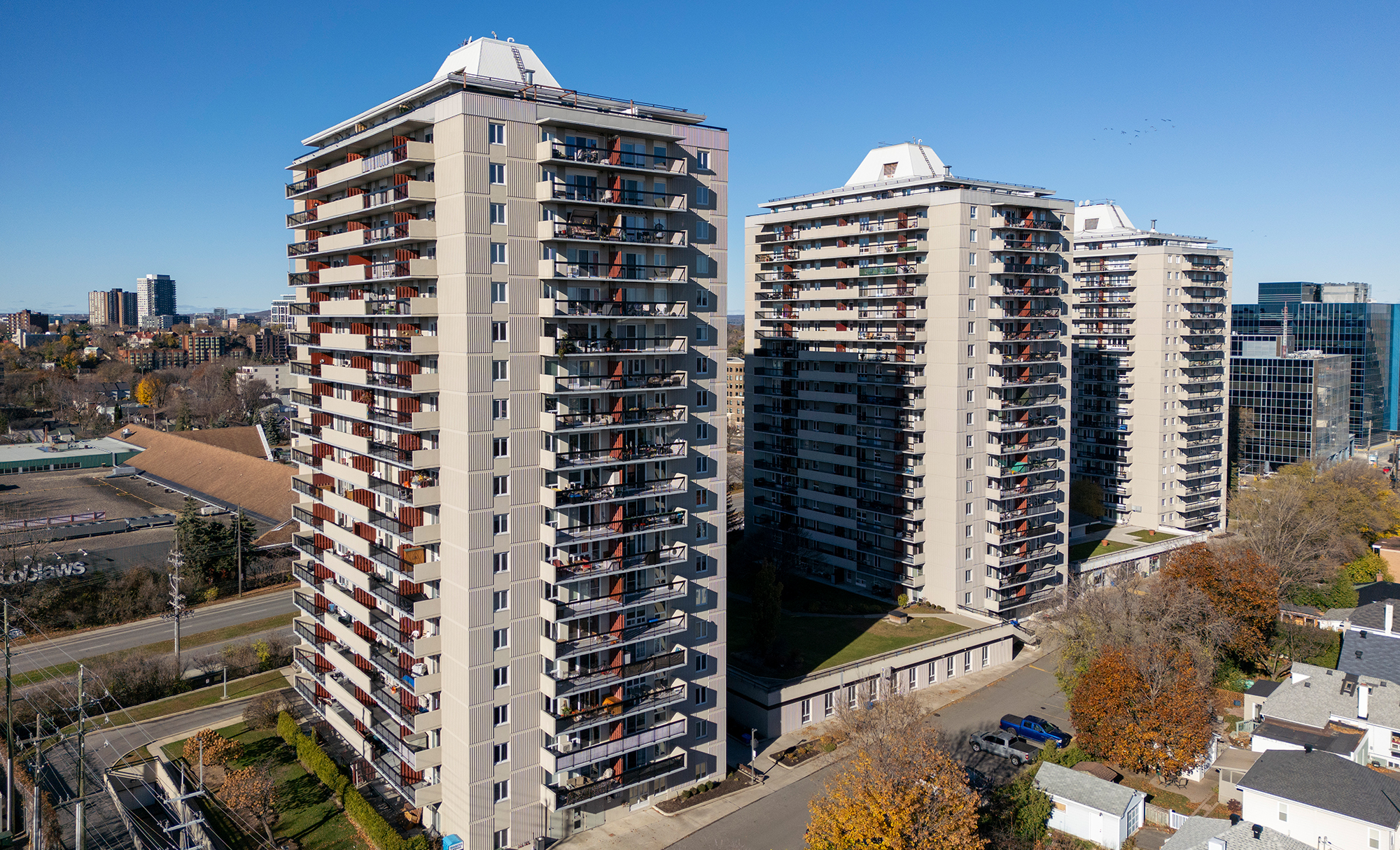 Maddison Construction Limited (MCL) managed the restoration of two elevations of concrete balconies on a 19-storey condominium tower. The project included removing and reinstating structural concrete at height, applying new acrylic coatings on vertical elements, and BASF traffic coatings on balcony decks. Structural control joints were resealed, and balcony railings were inspected, sanded, painted, and updated with newly fabricated steel foot plates.