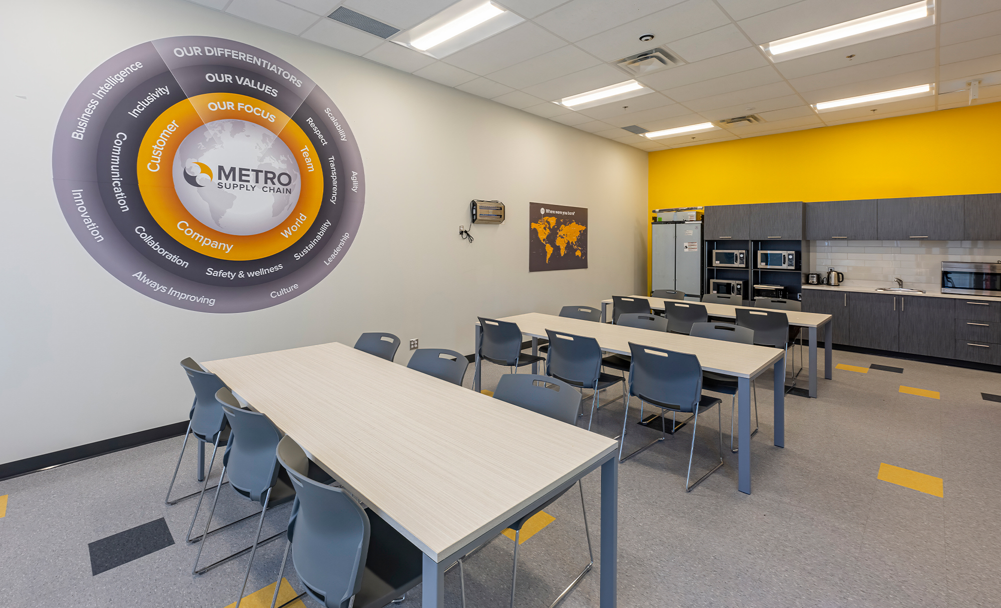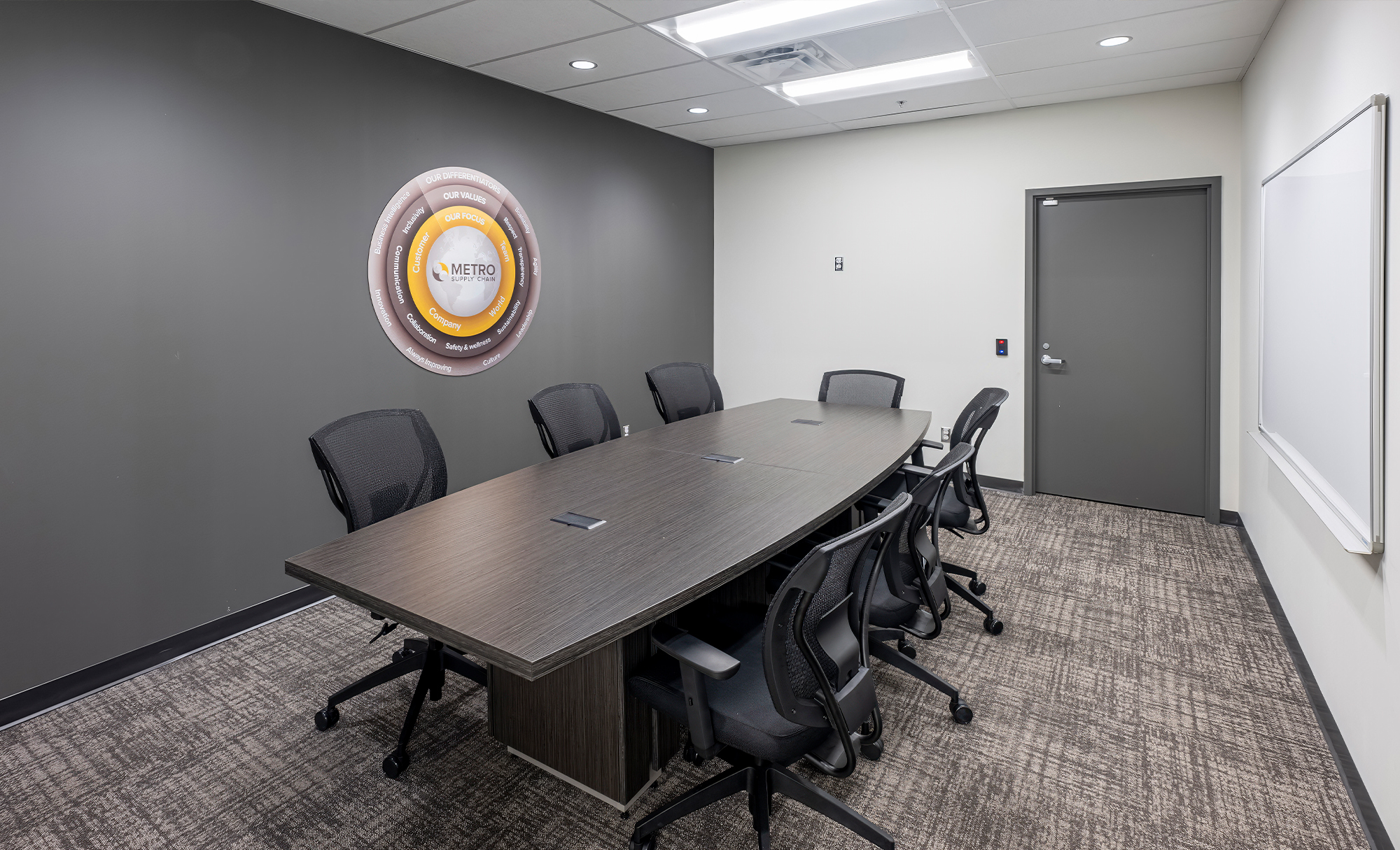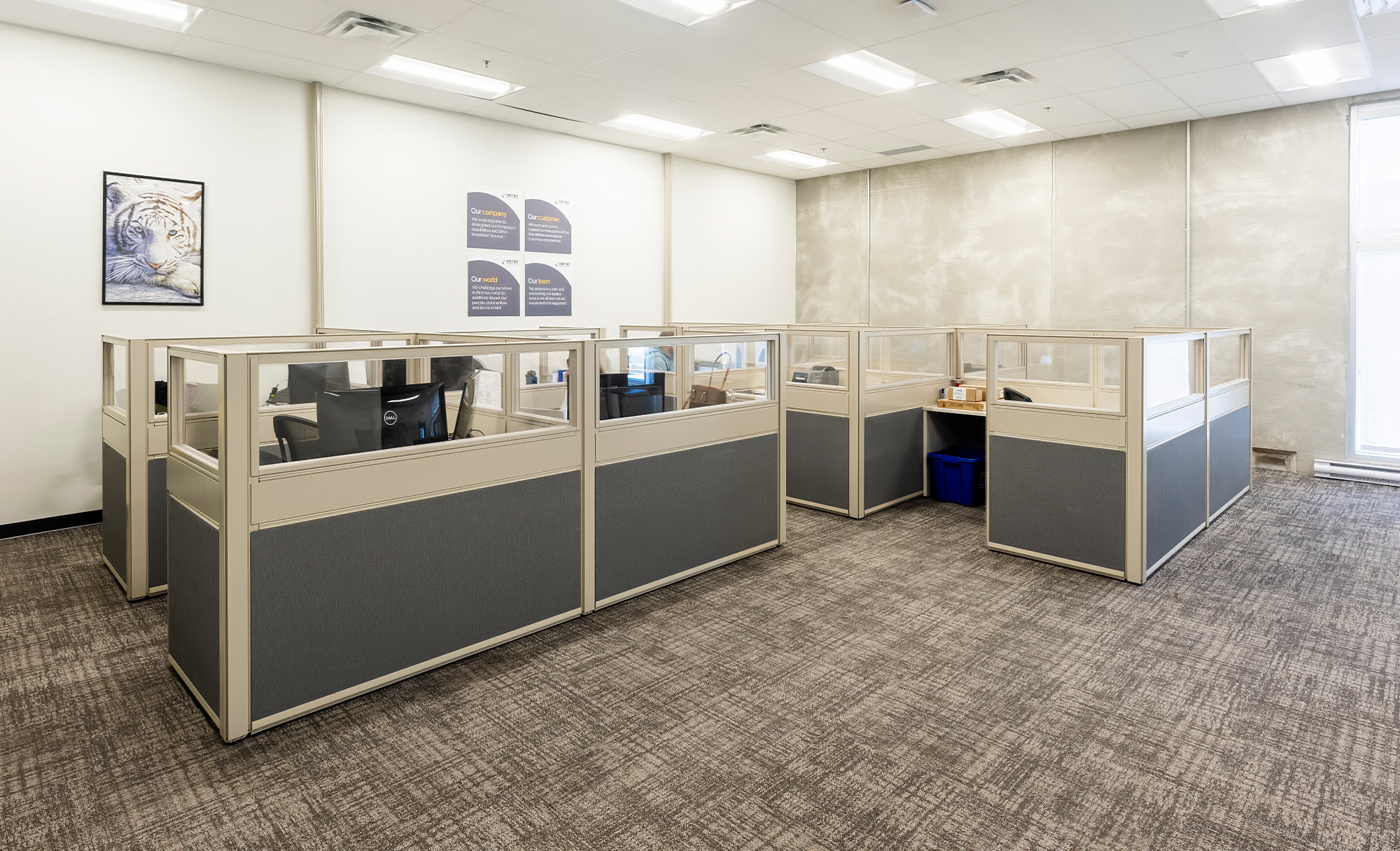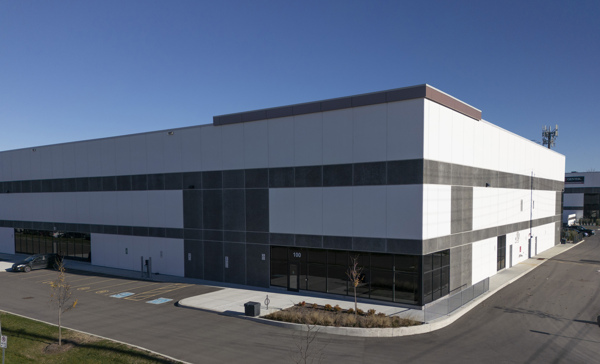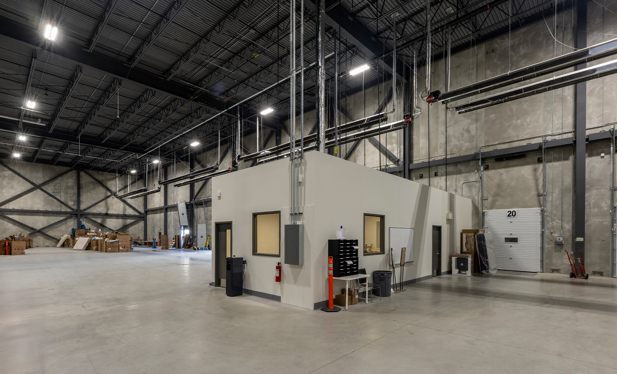Interior work featured four washrooms, including an accessible universal washroom with automatic doors, key card access points and a server room. A standalone shipping office created an additional work zone within the warehouse.
